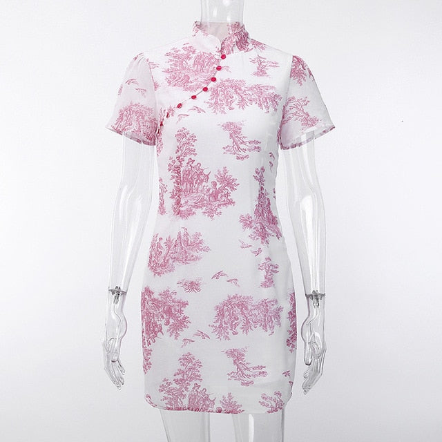 VOZRO Chiffon Cheongsam Sexy Winter Party Dress Women Temperament Stand Lead Short Sleeve Printing Cheongsam China Wind Vestido