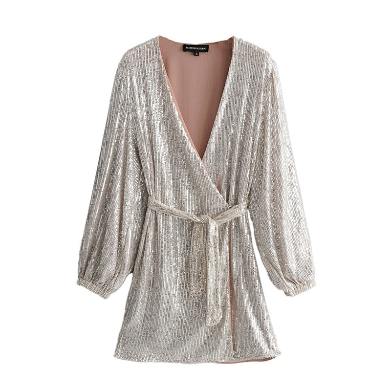 ZXQB Sequins V Neck Dresses Women Fashion Long Puff Sleeve Dress Mini Ladies Elegant Tie Blet Waist Dresses Female Outfit